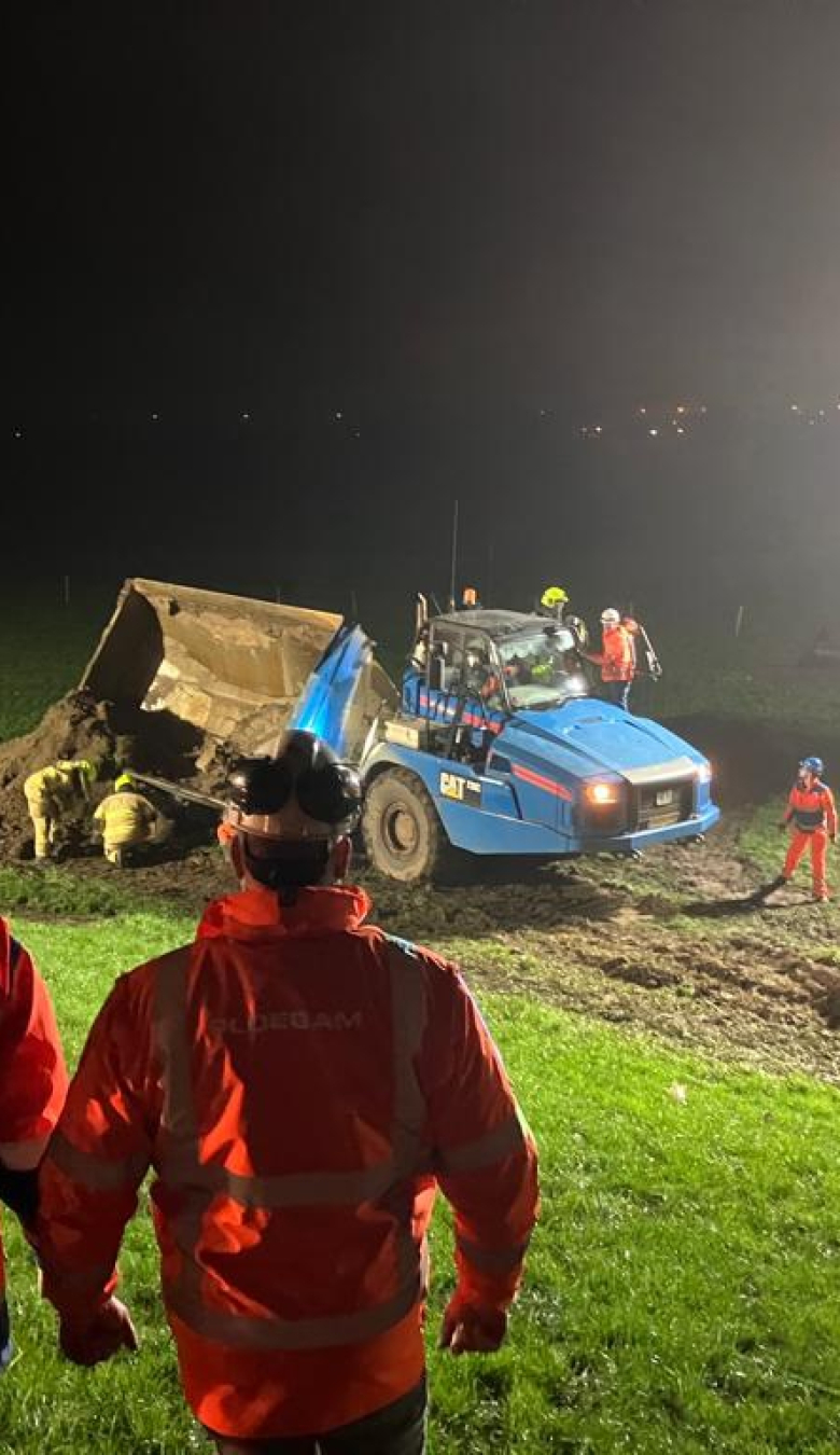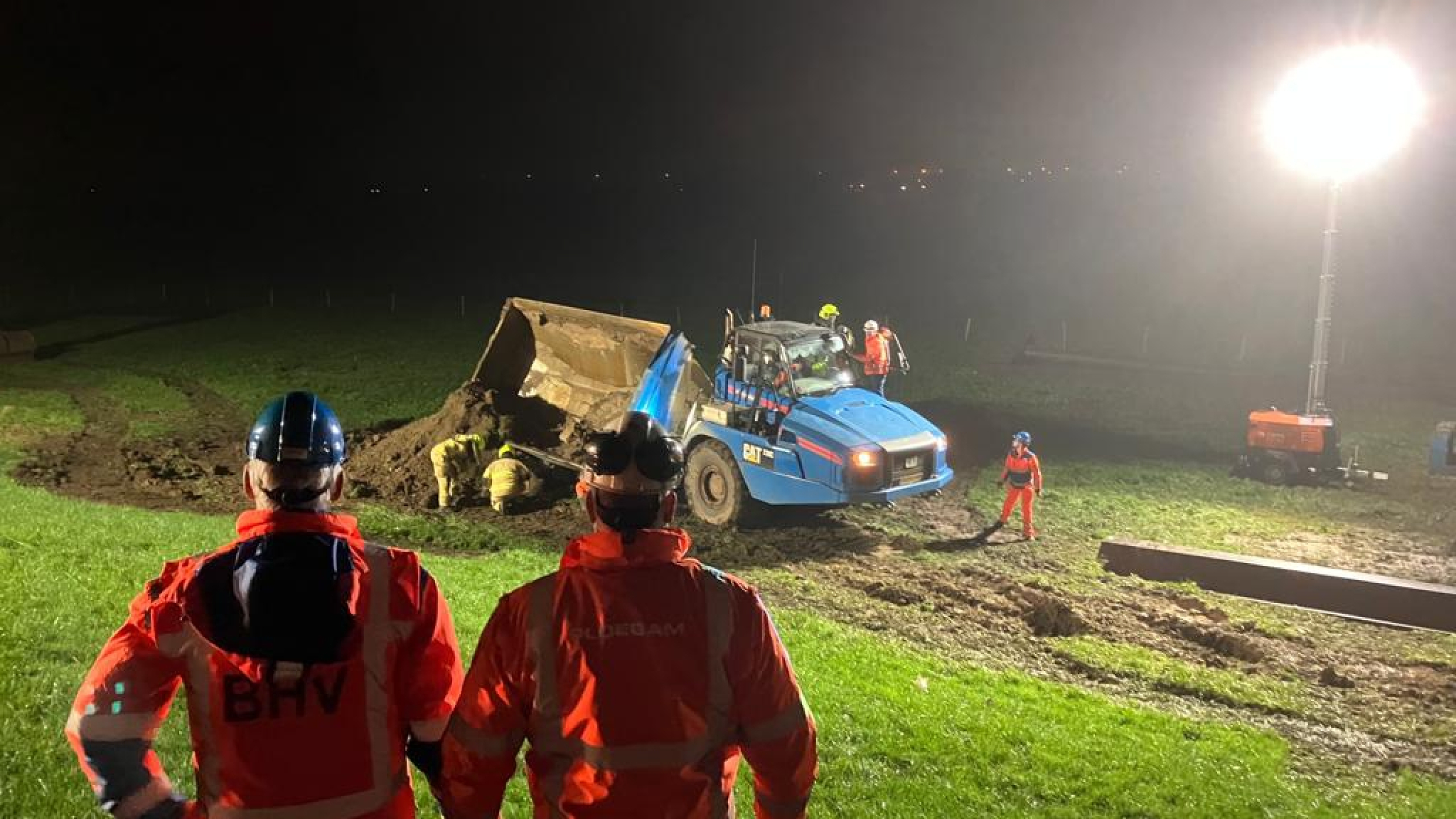 Jurgen van de Leemput is VGM-coördinator bij Ploegam en coördineerde de oefening: “We hebben op de dijk een grootschalig ongeval nagebootst. We hadden een dumper op z’n kant gelegd, met een ‘gewonde’ onder een berg met zand. In de cabine zat een collega die een ‘hartaanval’ kreeg en dan was er nog ‘iemand’ onder een damwandplank gekomen. Je begrijpt dat zo’n situatie vraag om grootschalige inzet van hulpdiensten. Die werkten ook graag allemaal mee. In het filmpje zie je impressie van de avond. De volgende stap is samen leren van de oefening en blijven sturen op het voorkomen van incidenten.”