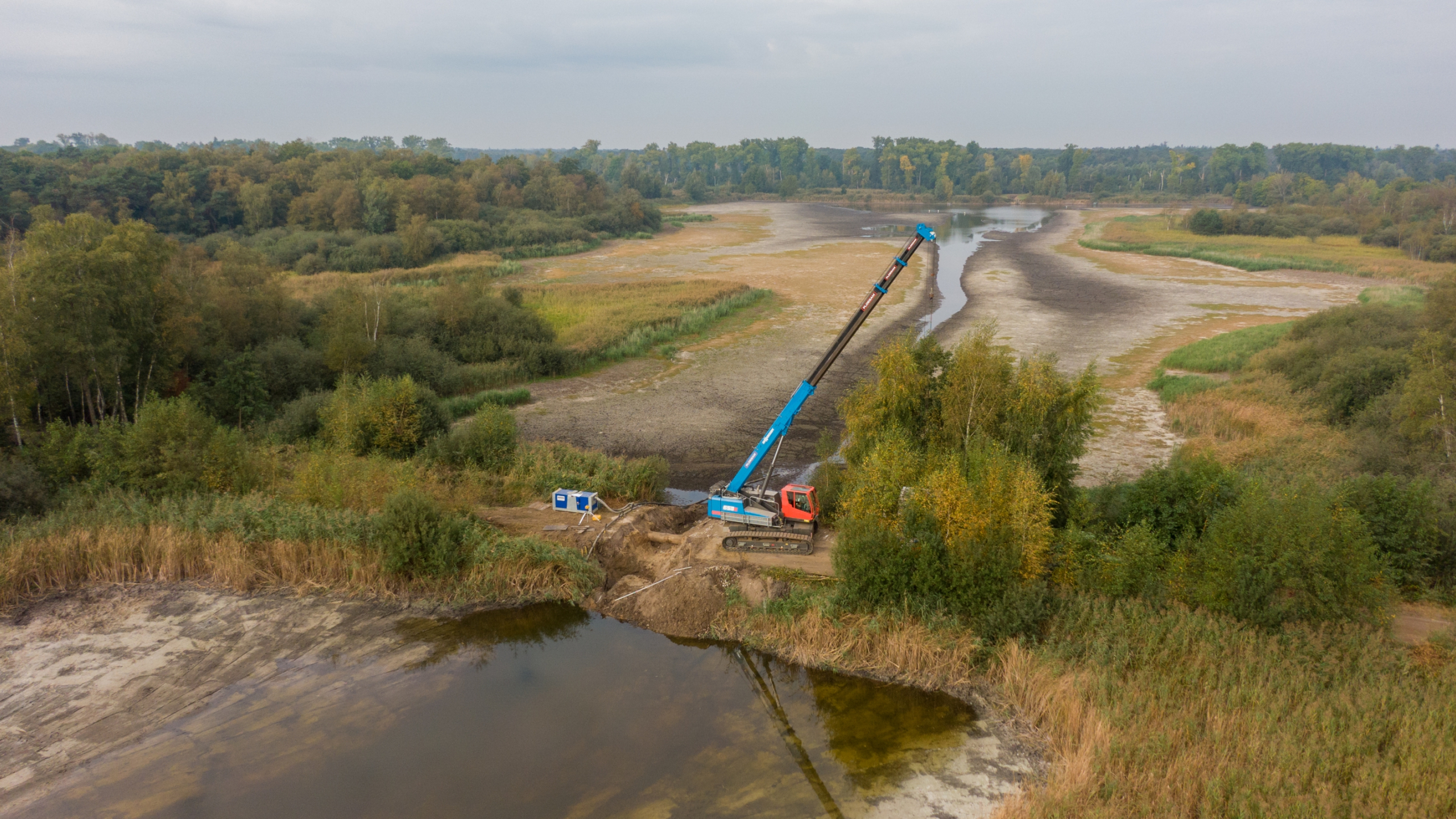 Afgelopen zomer begonnen de werkzaamheden aan het Greveschutven. Brabants Landschap liet het water via stuwtjes wegstromen. Zo kon het voedselrijke slib op de bodem van het ven en de naastgelegen ‘tussenvijver’ verwijderd worden. Hoewel het voor de natuur niet gunstig is, kwam de droge zomer voor dit project wel van pas. Ploegam kon het werk hierdoor goed uitvoeren. Het vrijgekomen slib is in oktober en november afgevoerd.