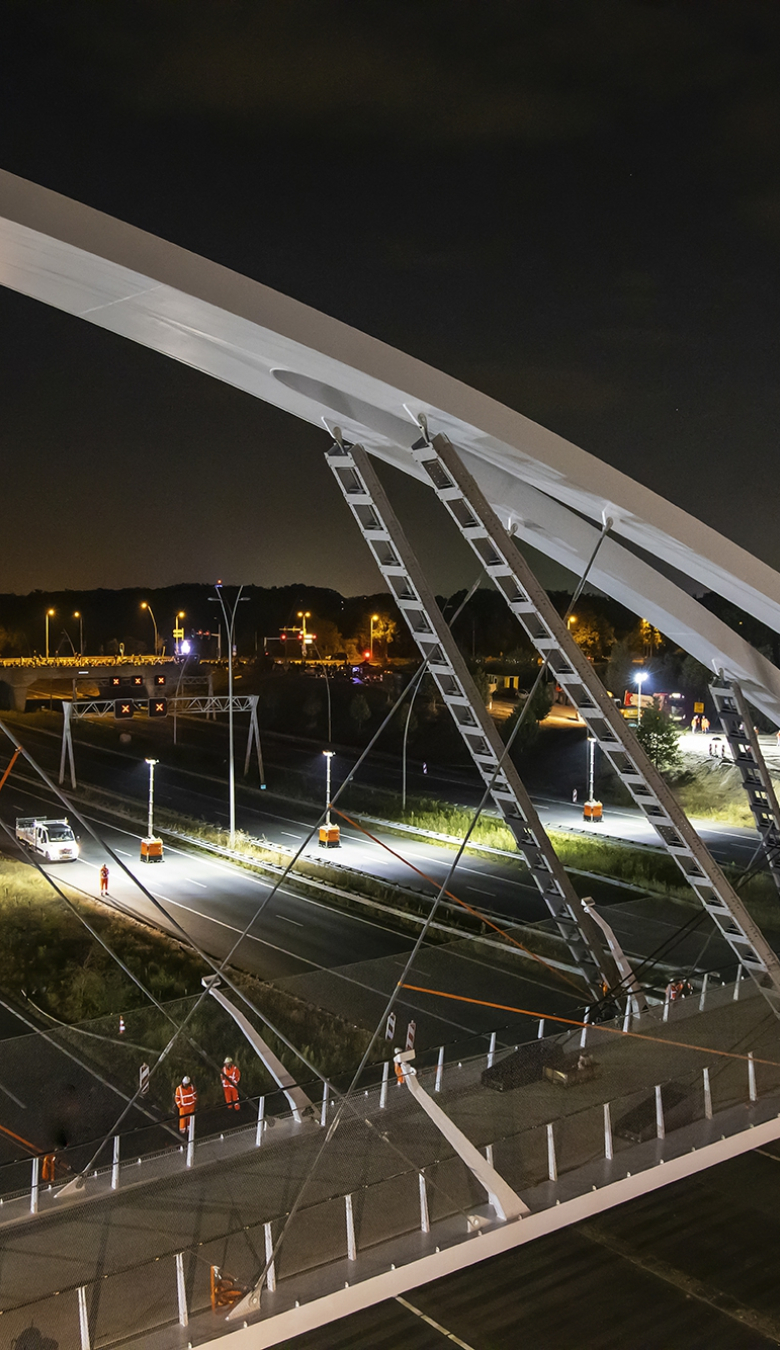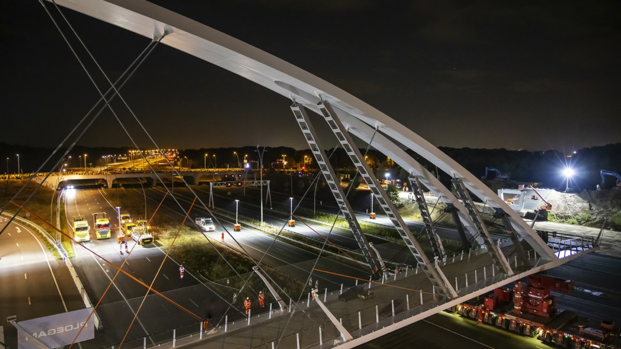 De afgelopen maanden is de fietsbrug door Dura Vermeer, Ploegam en CSM Steel Structures opgebouwd op de bouwplaats langs de A2 en N2 ter hoogte van Novotel. De brug is te zwaar om op zijn plek gehesen te worden. Daarom is hij met behulp van zogeheten platformwagens naar zijn plek gereden.