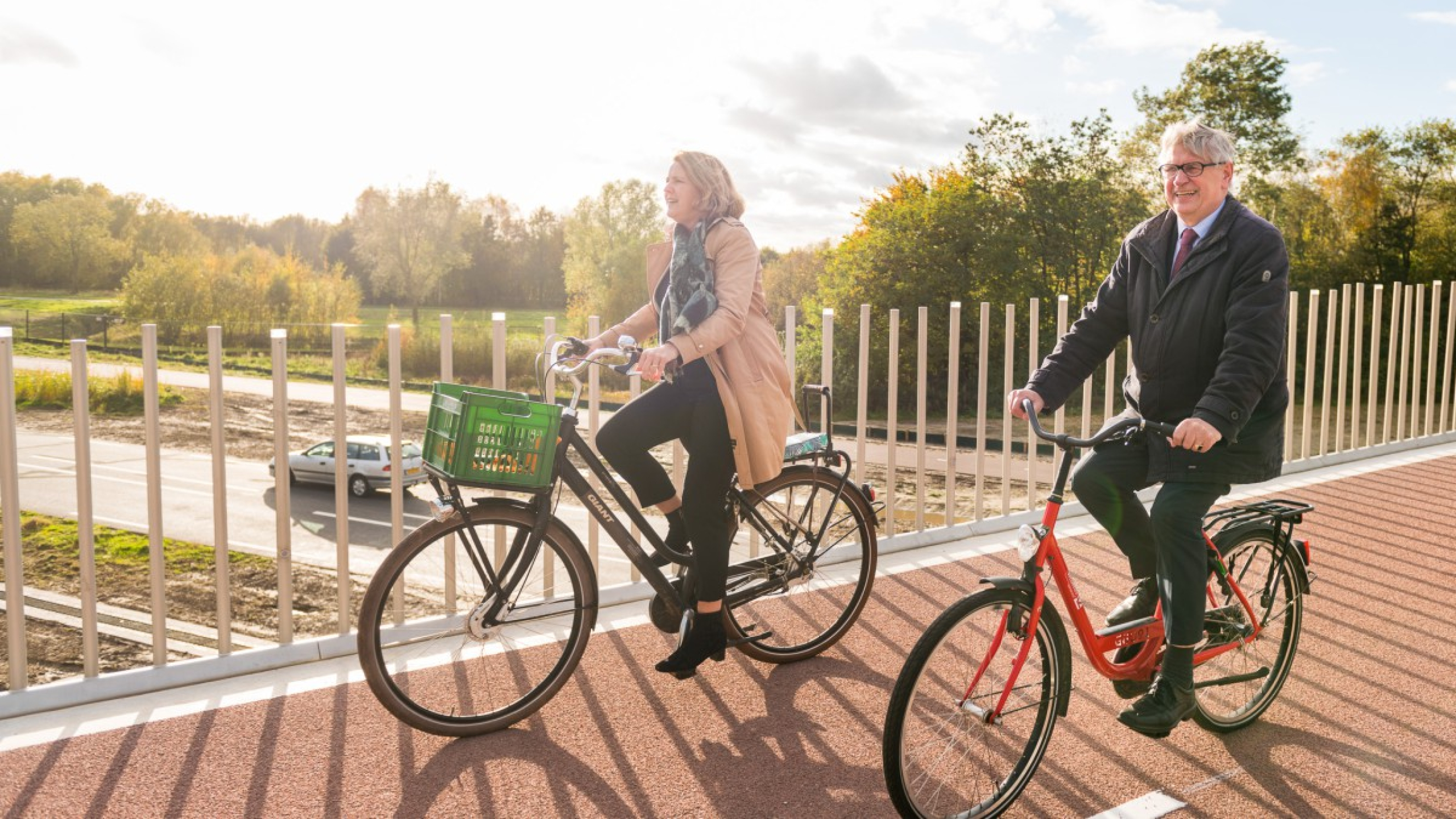Nog voordat de fonkelnieuwe fietsbrug over de eveneens vernieuwde Spottersweg is geopend, rijden maandagmiddag de eerste gebruikers er al overheen. Even later gevolgd door de wethouders van Eindhoven en Oirschot die het lintje komen doorknippen.