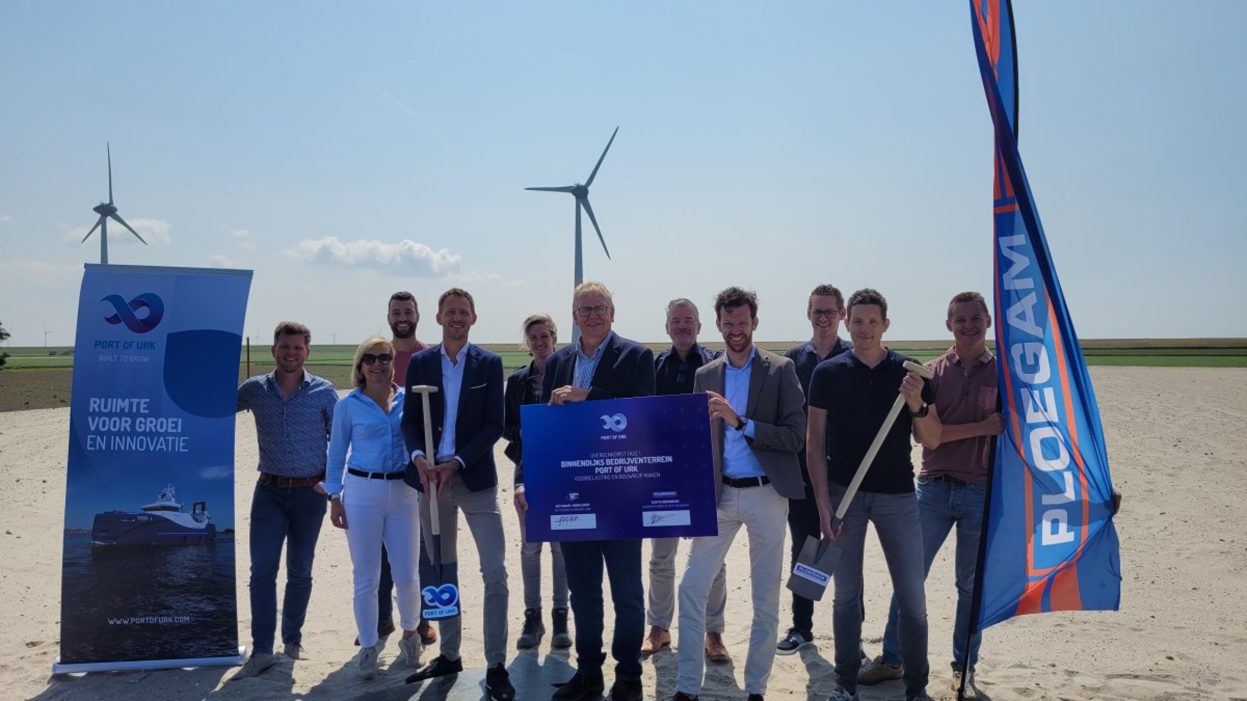 Ploegam tekende op maandag 19 juni een overeenkomst met gemeente Urk voor het bouwrijp maken van de eerste fase van het bedrijventerrein van Port of Urk. Wij kwamen als beste inschrijver uit de bus van het uitvoerige aanbestedingstraject. Na de bouwvak van 2023 beginnen we met de eerste grote werkzaamheden op het terrein langs de Domineesweg. Het bouwrijp maken van het bedrijventerrein bestaat onder andere uit het voorbelasten van de bodem en het aanleggen van (bouw)wegen, watergangen, riolering en nutsvoorzieningen.