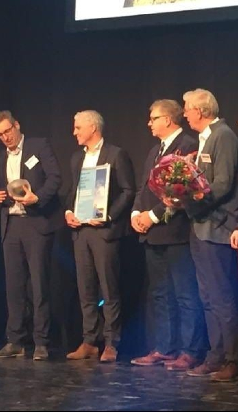 De Unie van Waterschappen reikt jaarlijks de Waterinnovatieprijs uit aan projecten die uitblinken in innovativiteit. Projectdirecteuren Theo Reinders van Projectbureau Ooijen-Wanssum en Jules Janssen van Mooder Maas mochten de prijs, een glaskunstwerk van kunstenaar Gert Bullée, in ontvangst nemen. “We zijn bijzonder trots dat we samen met onze partners deze nieuwe dijken hebben kunnen realiseren in Gebiedsontwikkeling Ooijen-Wanssum. De innovatieve dijken zijn tot stand gekomen dankzij optimale samenwerking tussen Projectbureau Ooijen-Wanssum, Mooder Maas (combinatie Dura Vermeer en Ploegam), Waterschap Limburg, Fugro, H+N+S Landschapsarchitecten en POV Dijkversterking met Gebiedseigen Grond.” aldus Theo Reinders. Jules Janssen vult aan: ”De waardering van bewoners van het gebied dat we opleveren, is voor ons het grootste compliment. Dat we daar nu deze prestigieuze prijs op het gebied van waterveiligheid aan toe mogen voegen, is een prachtige kroon op onze samenwerking.” In 2018 mocht Gebiedsontwikkeling Ooijen-Wanssum al de Ruimtelijke Kwaliteitspluim in ontvangst nemen vanwege de continue aandacht voor kwaliteit, van idee tot uitvoering.
