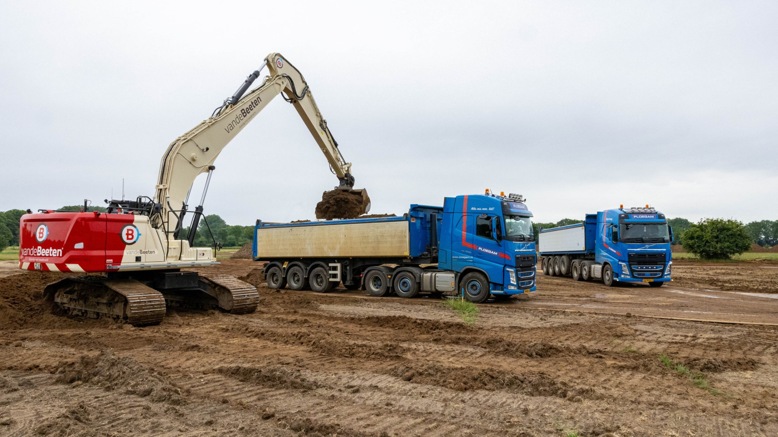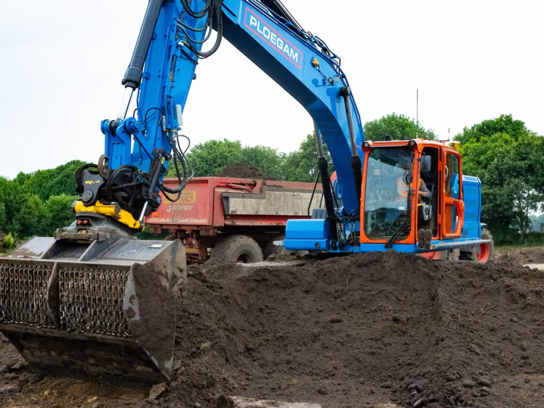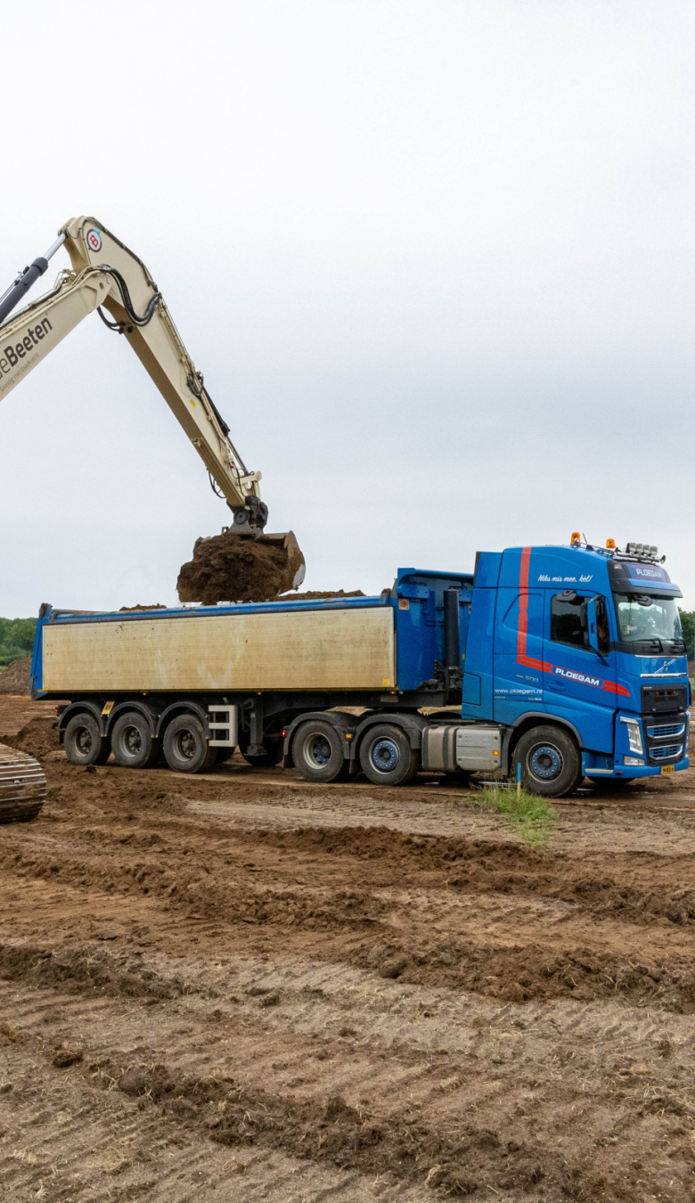 “Het hele gebied beslaat zo’n 45 hectare grond, waarvan we in totaal zo’n 25 hectare afplaggen,” vertelt onze uitvoerder Niels Radix. “We zijn zo’n vier weken geleden begonnen met afplaggen. Dat houdt in dat we het maaiveld verlagen: we plaggen de voedingsrijke bodem af tot de oorspronkelijke schrale grond overblijft. In de praktijk houdt dat in dat we 20 tot 40 centimeter van de bodem afgraven. Hierdoor komt de grondwaterstand dichterbij de oppervlakte en ontstaat er meer biodiversiteit.” In totaal graaft Ploegam 70.000 kuub grond af. Voor de afvoer van de grond zetten we vrachtwagens in. De grond uit dit project zetten we in bij verschillende projecten. Niels: “Een deel van de grond vervoeren we met vrachtwagens naar de projecten Dijkversterking Wolferen-Sprok en Krib- en Oeververlaging Pannerdensch Kanaal. Het andere deel gaat met behulp van trekkers naar boeren in de omgeving die de grond op hun eigen land gebruiken. Zo is dit project weer een mooi voorbeeld van ‘werk met werk maken’.