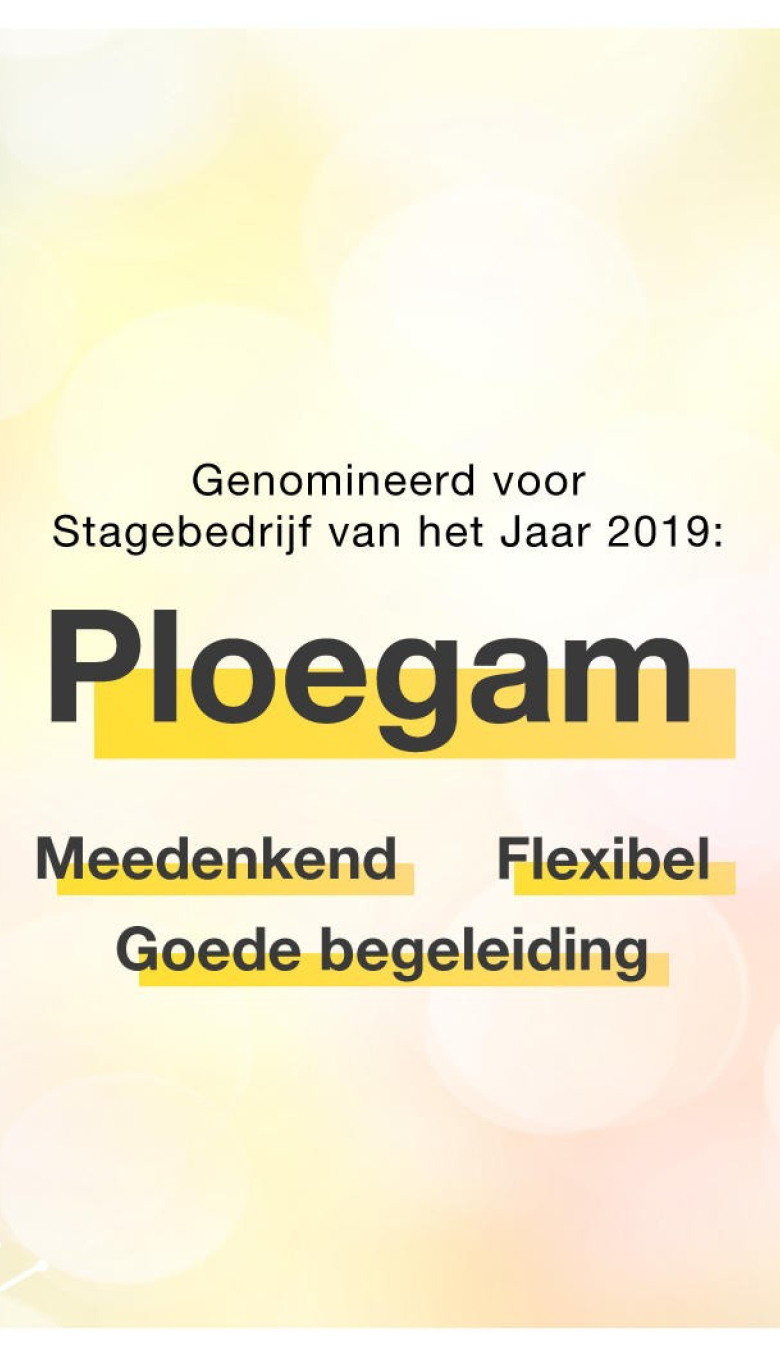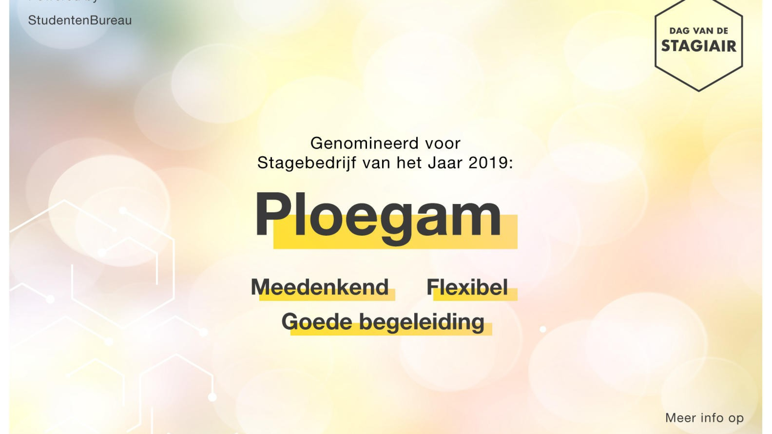 Op 22 mei is het Dag van de Stagiair. Ter ere daarvan wordt de award 'Stagebedrijf van het Jaar' uitgereikt. Het goede nieuws is dat Ploegam hiervoor is genomineerd. Volgens de website zijn wij als stagebedrijf meedenkend, flexibel en bieden we goede begeleiding. Dat is natuurlijk een mooi compliment!