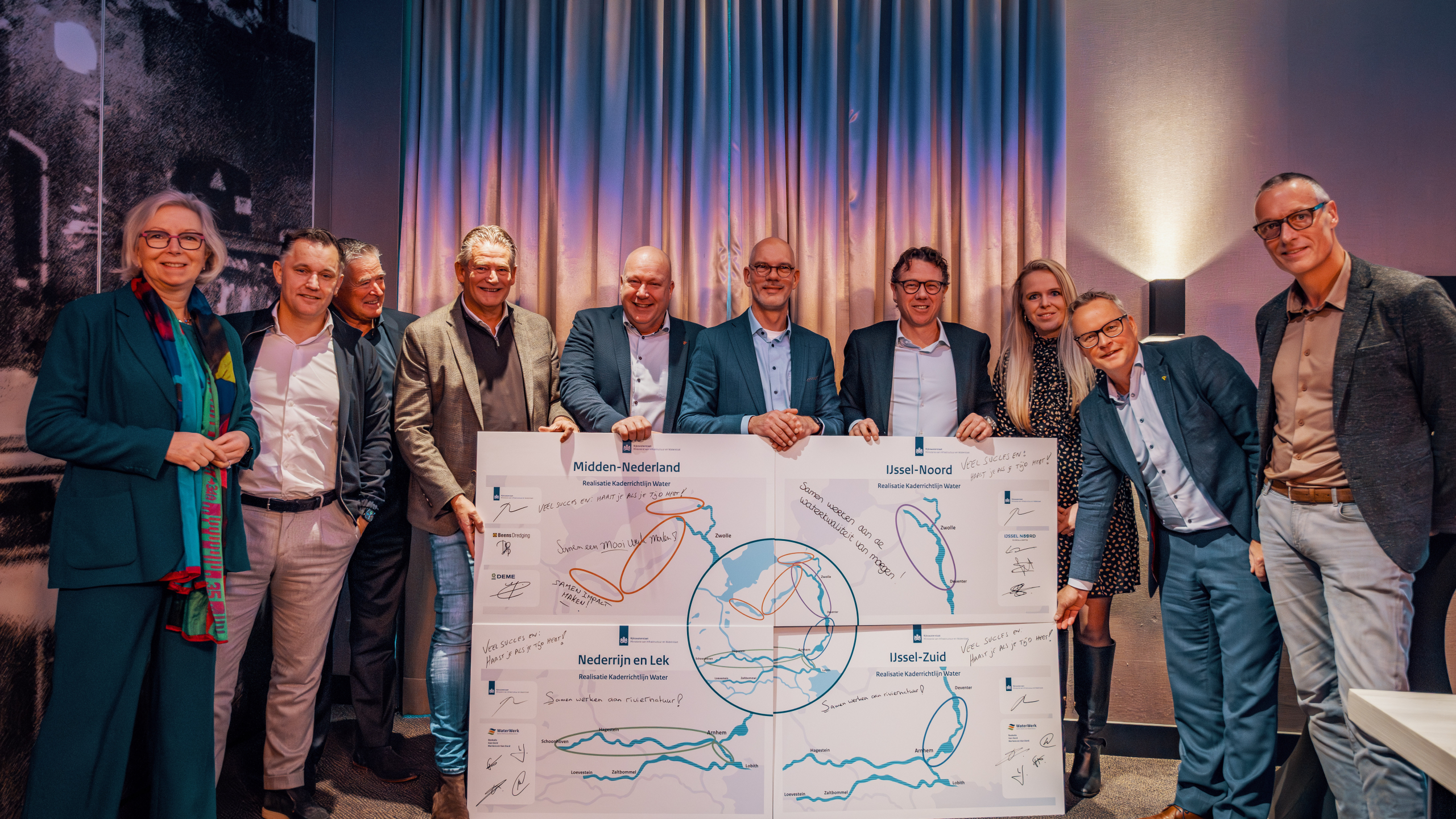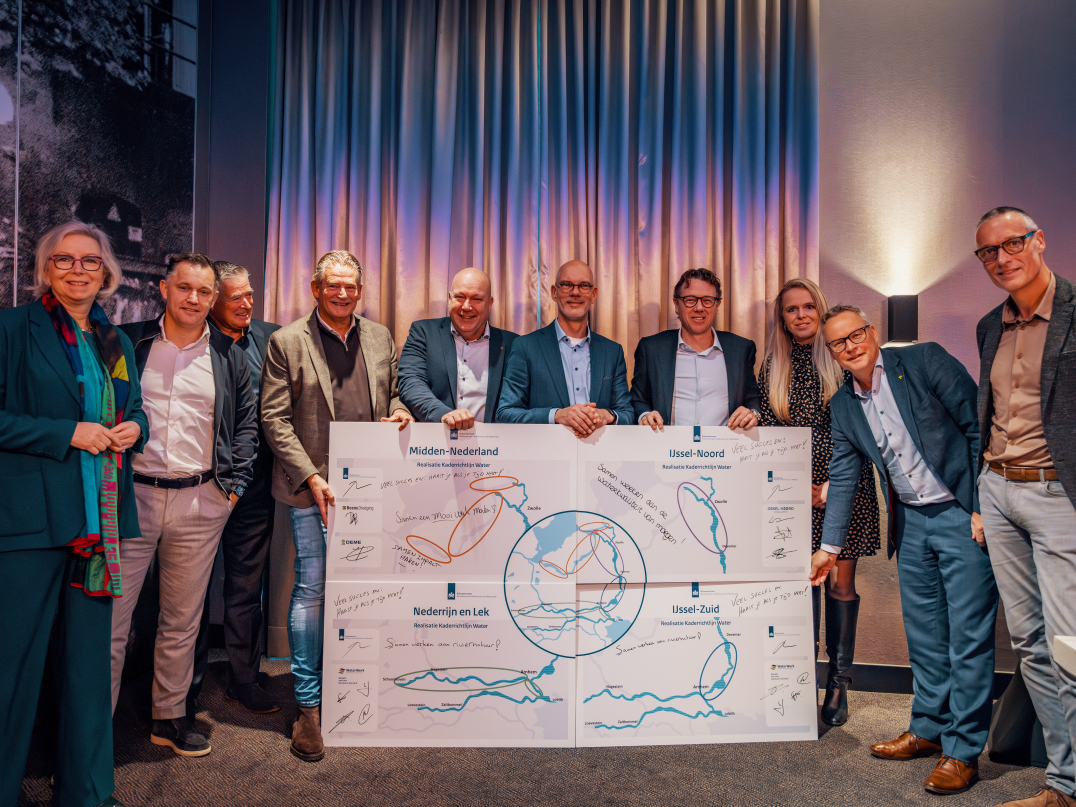 Ondertekening van de raamovereenkomsten voor de KRW-maatregelen Nederrijn-Lek, IJssel en de randmeren door (vlnr): Patricia Zorko (Rijkswaterstaat), Karts-Jan Beens (Beens Groep), Jaap van der Weele (DEME Environmental Nederland), Teun de Koning (Martens Van Oord), Wim Bovendeur (Boskalis), Maarten Spronk (Martens Van Oord), Ronald de Geus (Dredging & Infra), Ilvy Ploegmakers (Ploegam), Harbert van der Wildt (Dura Vermeer), Edwin van der Poel (GMB).