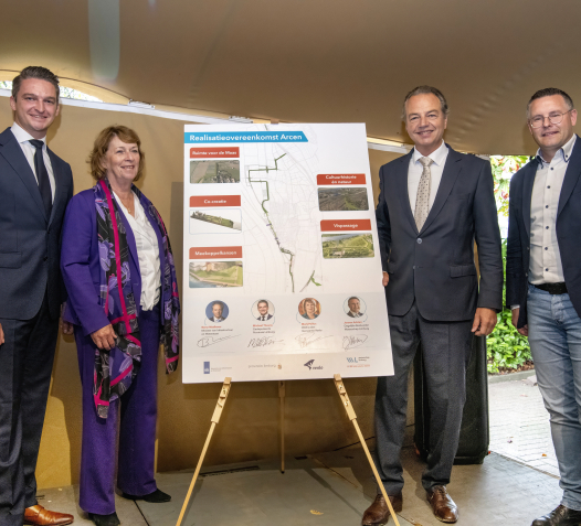 De realisatiefase van de dijkversterking en –verlegging in Arcen gaat nu echt van start. Dit bekrachtigden minister Barry Madlener, wethouder Marij Pollux, gedeputeerde Michael Theuns en waterschapsbestuurder Jeroen Achten met hun handtekening onder de realisatieovereenkomst. In Arcen wordt 5,1 kilometer dijk versterkt en verlegd met alle denkbare mogelijke type keringen. Door de dijkverlegging wordt het oorspronkelijk tracé ingekort tot 4,8 kilometer. In 2028 zijn alle werkzaamheden afgerond.