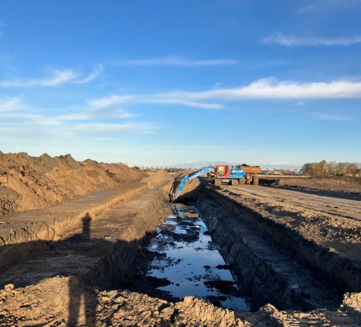 Reinier: “We zijn nu klaar met het grootgrondverzet en de watergangen zijn gegraven. De percelen zijn inmiddels opgehoogd en de voorbelasting ligt erop, waardoor de zettingstijd is ingegaan. Deze werkperiode staat in het teken van voorbereidende werkzaamheden, zodat we begin april weer buiten aan de slag kunnen. De wegcunetten voor het riool maakten we gereed en nu bereiden we de bemaling voor rioleringswerkzaamheden voor. De bemalings- en rioleringswerkzaamheden duren tot augustus van dit jaar. Verder zijn we bezig met de voorbereiding van een gestuurde boring. Onder de N352 komen 3 boringen onder elkaar te liggen, elk met een 90 centimeter doorsnede. De leidingen liggen straks 20 meter diep en zijn ieder 250 meter lang. De gestuurde boringen voeren we in mei en juni uit.”