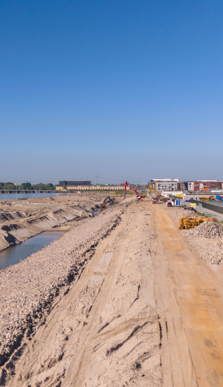 De waterkering beschermt het eiland tegen hoogwater en is cruciaal voor de veiligheid van toekomstige bewoners. Maar het is méér dan een technische ingreep: het is een fundament voor uiteindelijk een duurzame, groene en leefbare wijk met stadsstrand, natuurbaai, zes bruggen en een haven.
