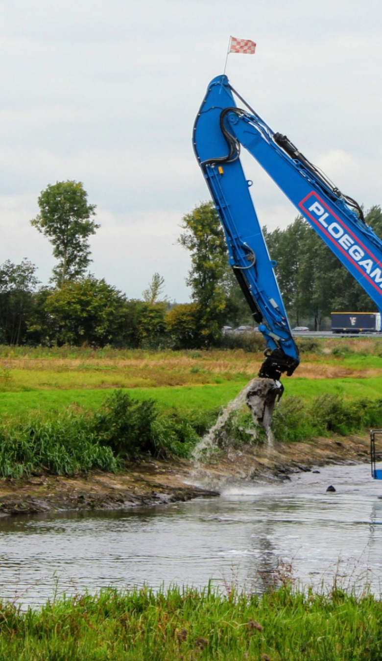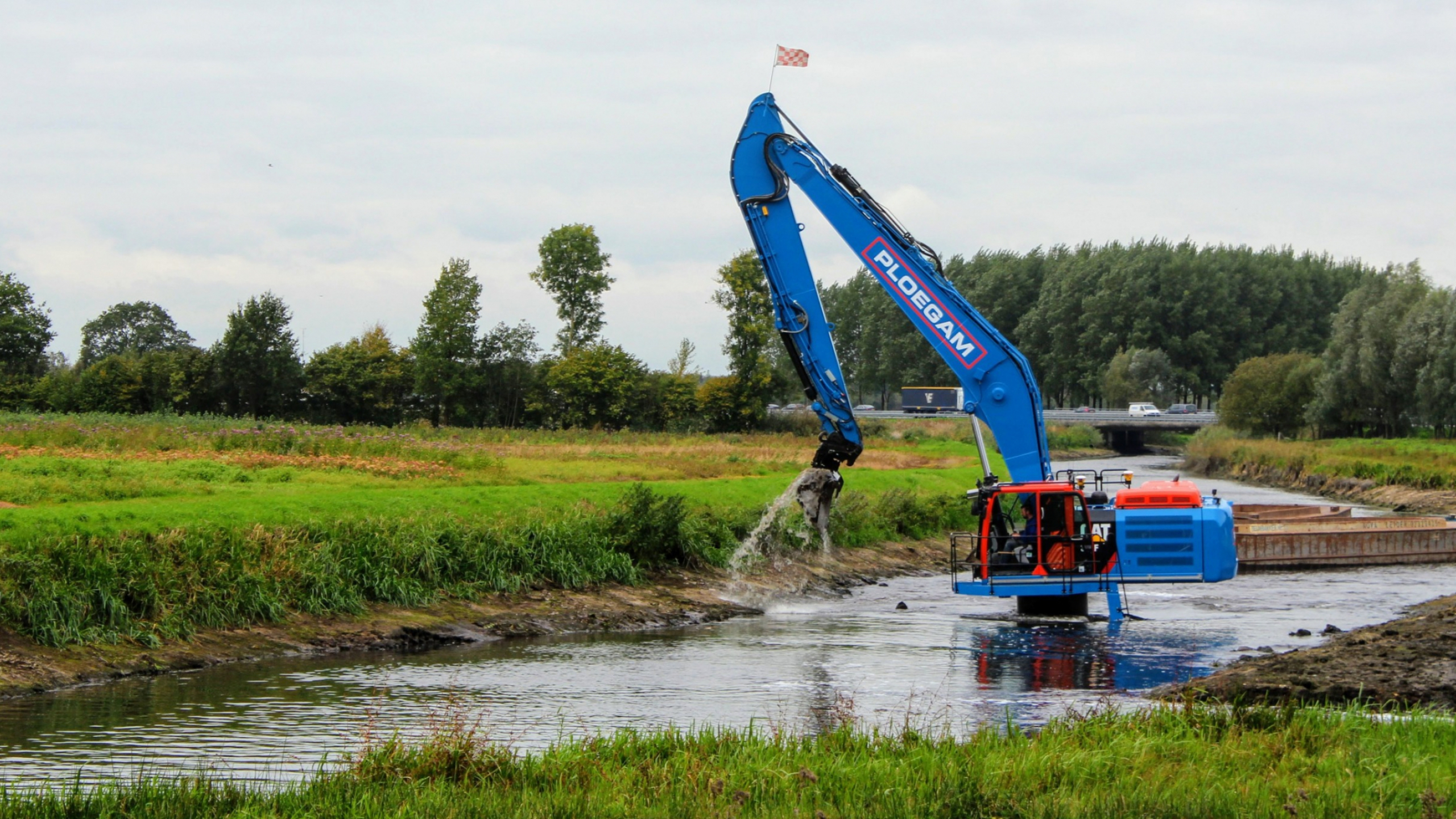 De werkzaamheden zijn op een unieke manier uitgevoerd. We verwijderden de materialen met behulp van een verhoogde kraan, die over de waterbodem heen reed. De CAT 340F LRE is verhoogd met een pilon van één meter hoog. Op die manier zorgden we voor een minimale overlast voor de omgeving.
