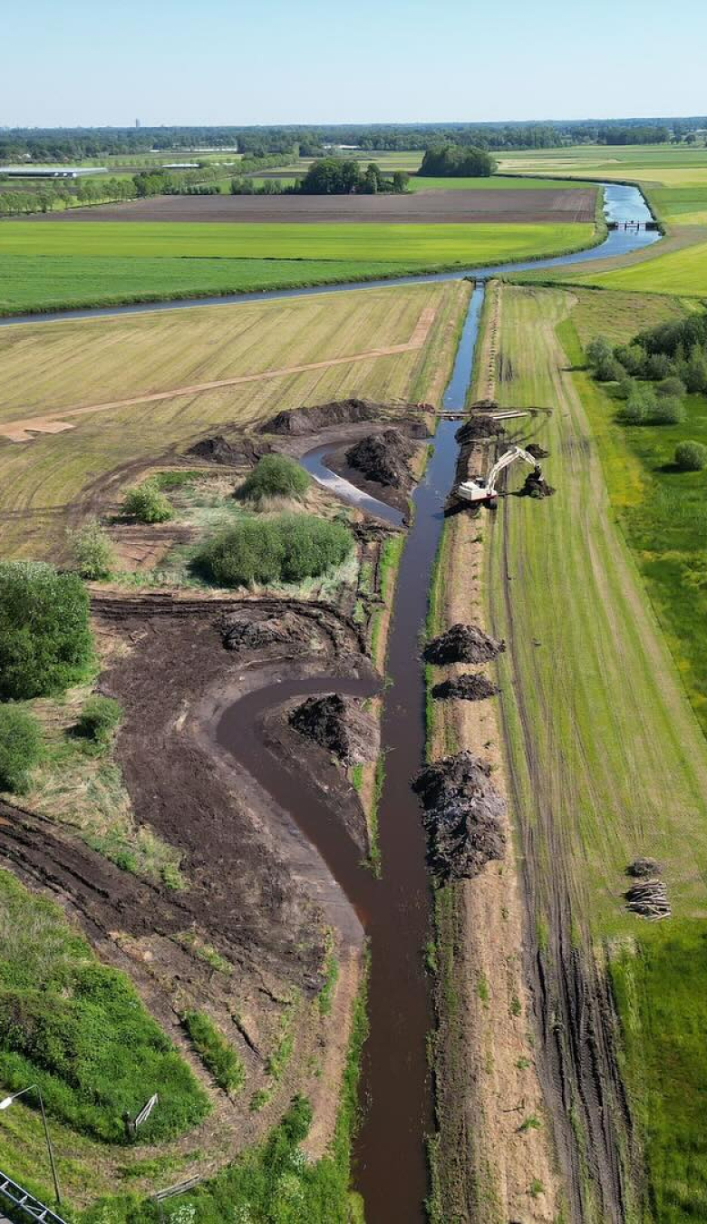 “We hebben de dijk langs de Essche Stroom verbeterd. We creërden een breder stroomprofiel en een betere afvoer van overtollige water en dus droge voeten voor de omgeving. De nieuwe dijk ligt acht meter het binnenland in. Kenmerkend voor de dijk is het flauwe talud wat bijdraagt aan de biodiversiteit. De opbouw van de dijk is bijzonder: we startten met een kern van zand, dan een laag bevergaas (bescherming tegen graafdieren), dan een laag erosiebestendige klei en vervolgens een toplaag van zwarte grond. De toplaag zaaiden we in met gras.”