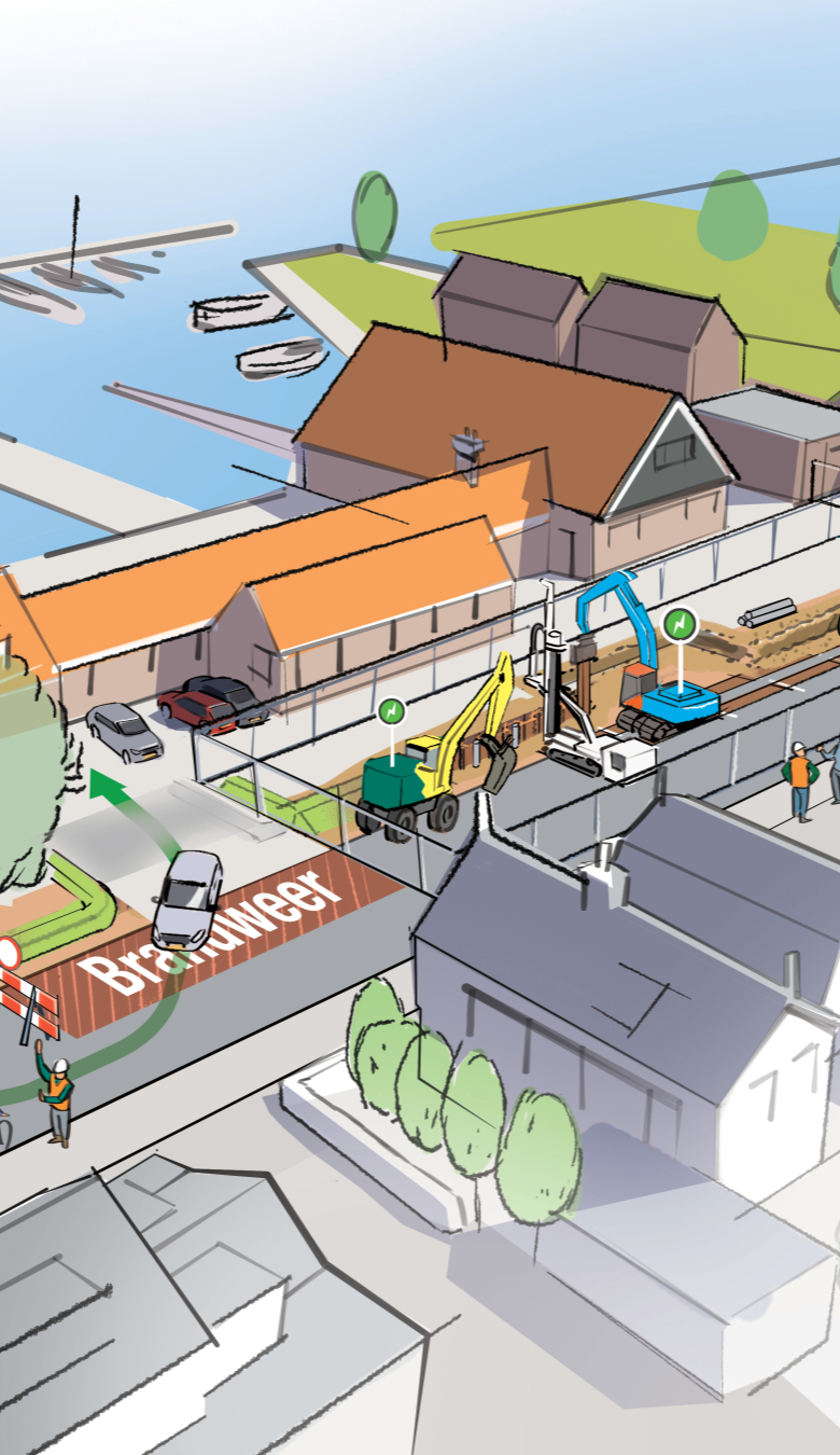 Johan Peters vertelt: "We brengen met een stalen damwand en buispalen een hoogtescherm aan. Dit is ook meteen de grootste uitdaging in het project. Dit hoogtescherm van ongeveer 2100 meter lang loopt dwars door 65 voortuinen van omwonenden. We zetten daarom in op omgevingsmanagement. We communiceren duidelijk en tijdig met de omwonenden en brengen de voortuinen na onze werkzaamheden weer terug in de oorspronkelijke staat. Een gebiedsassistent waarborgt altijd de veiligheid en bereikbaarheid van de omgeving tijdens werkzaamheden. De opdrachtgever heeft ons plan voor omgevingsmanagement met een 10 beoordeeld, dus ook zij hebben vertrouwen in deze aanpak."