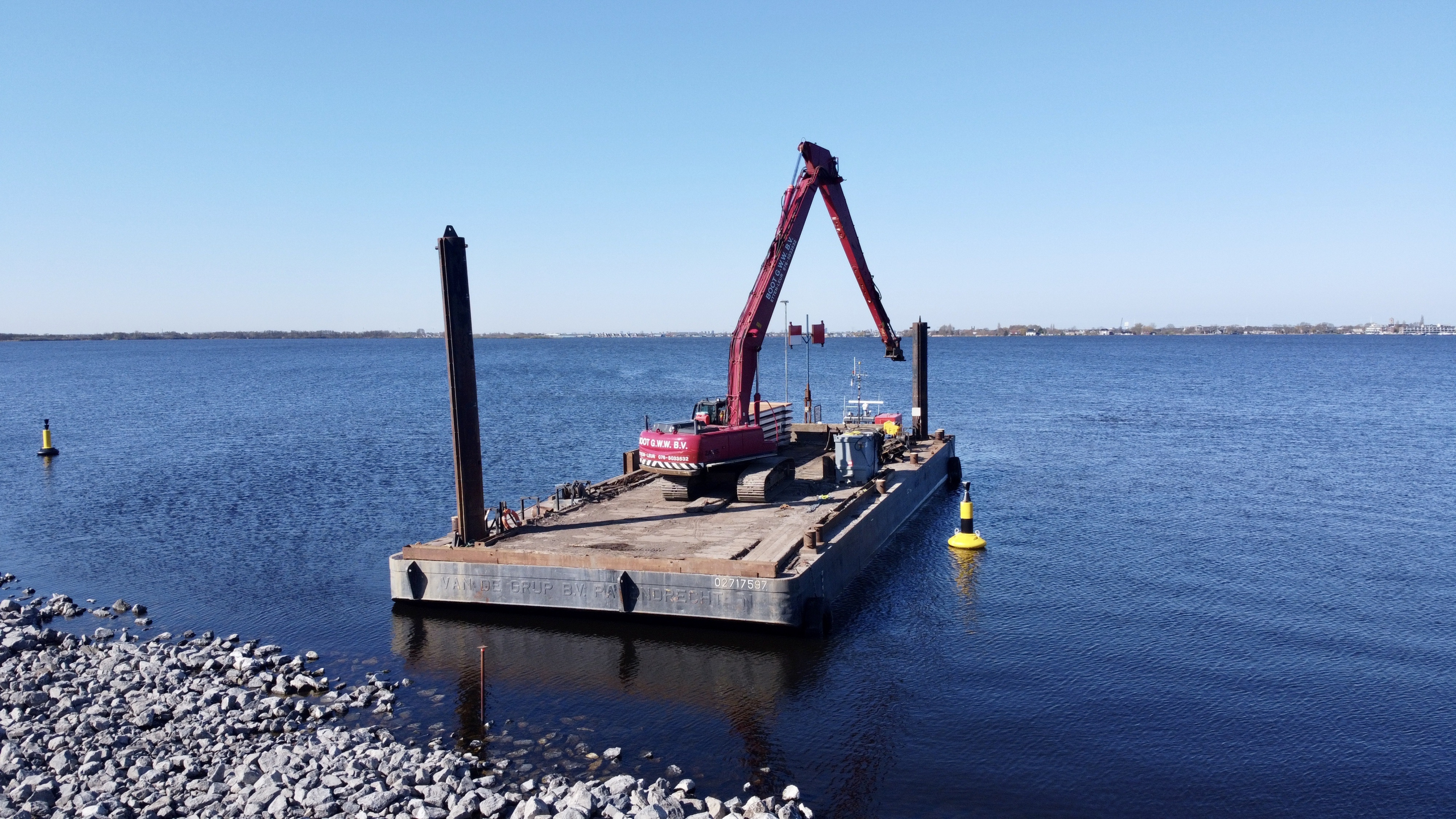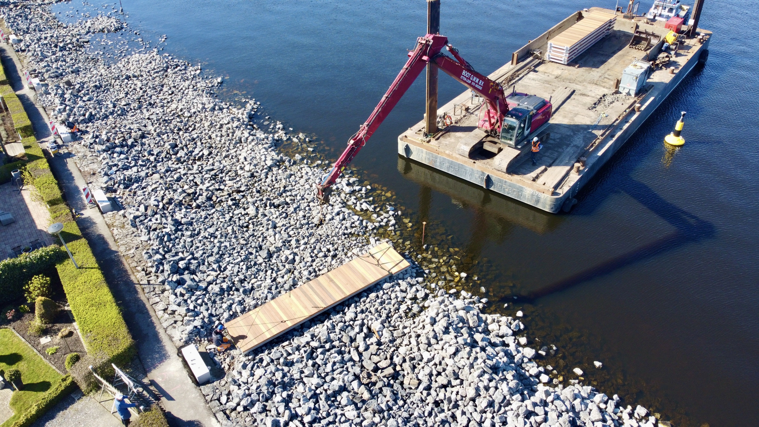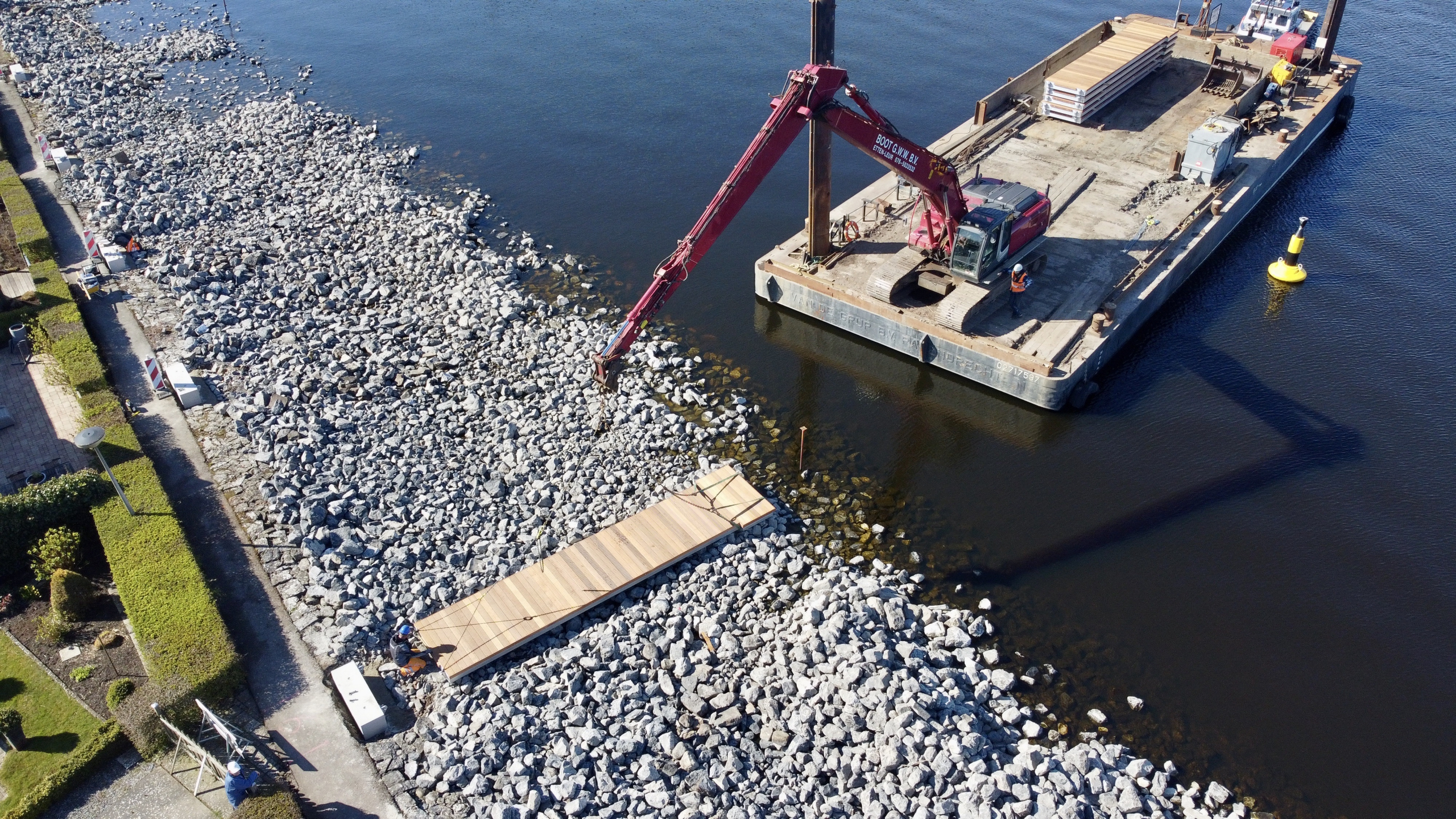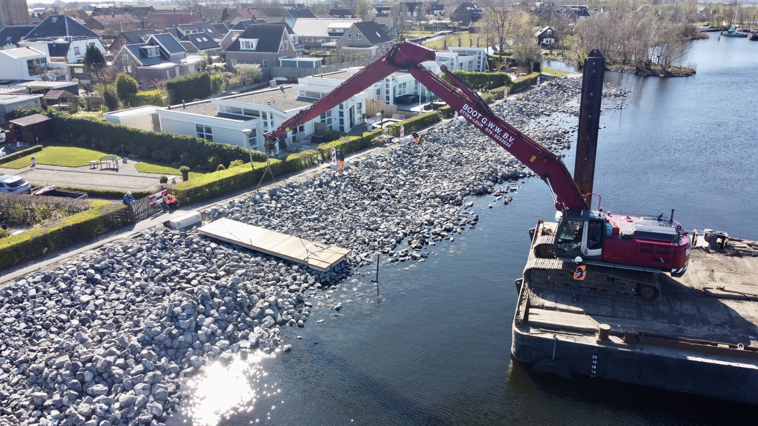 Paul vertelt: “Om wateroverlast in de toekomst tegen te gaan, is een nieuwe oeverbescherming aangebracht. Samen met de opdrachtgever is besloten de waterkering te versterken met 23.500 ton steenbestorting. De oeverbescherming die we aanbrengen, heeft een tweeledig doel: vergroten van de functionaliteit en verhogen van de stabiliteit van de waterkering.