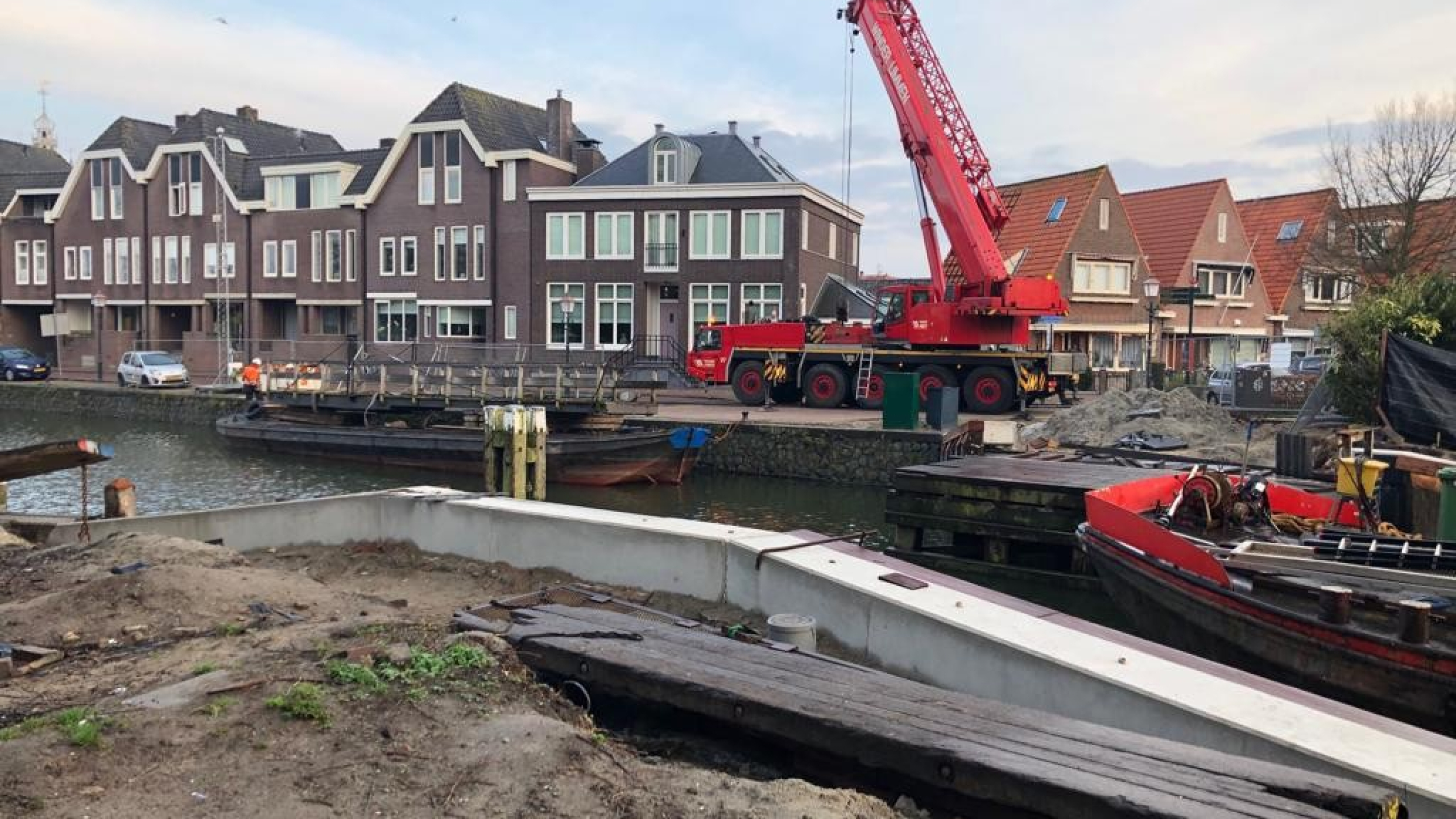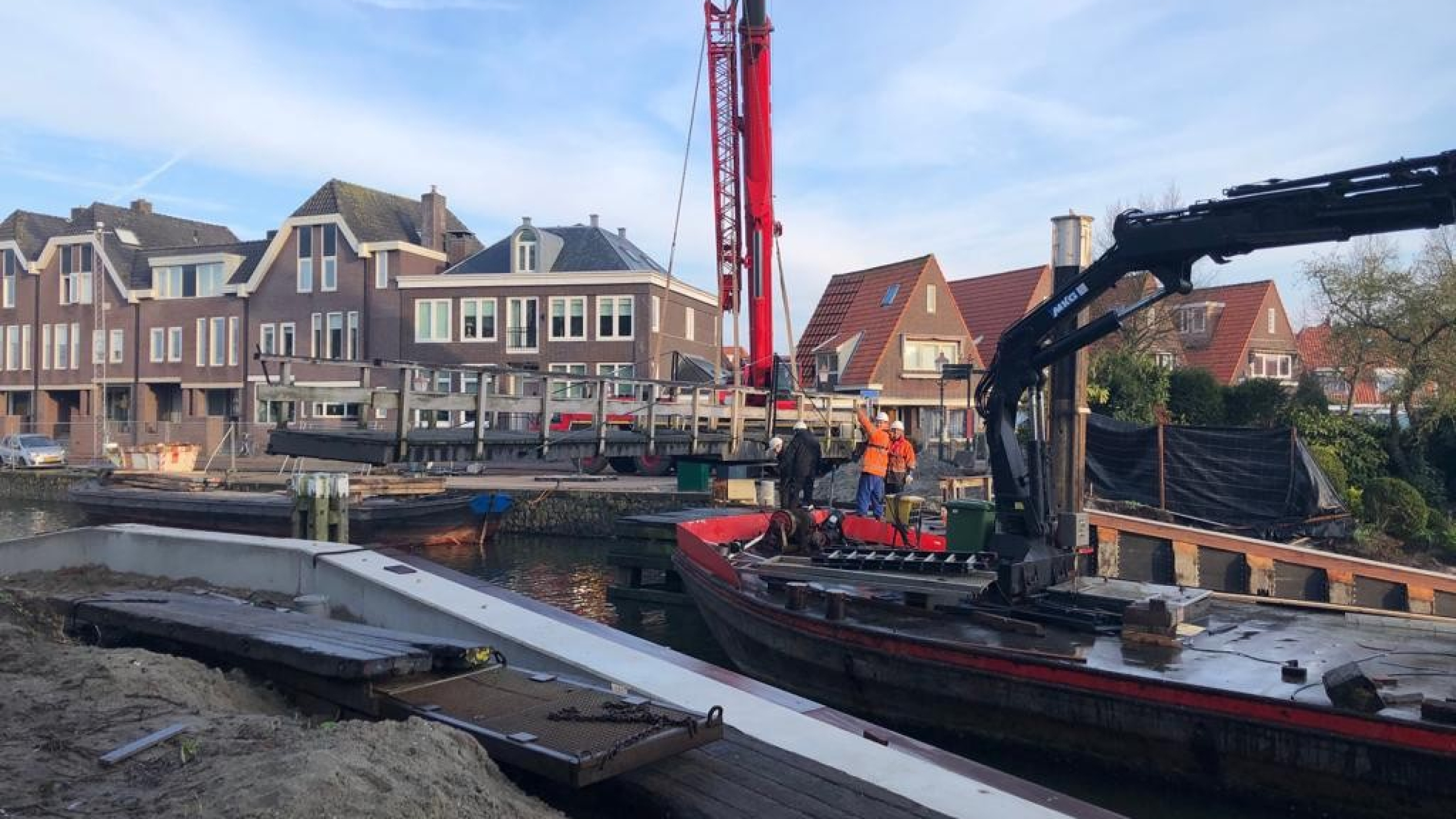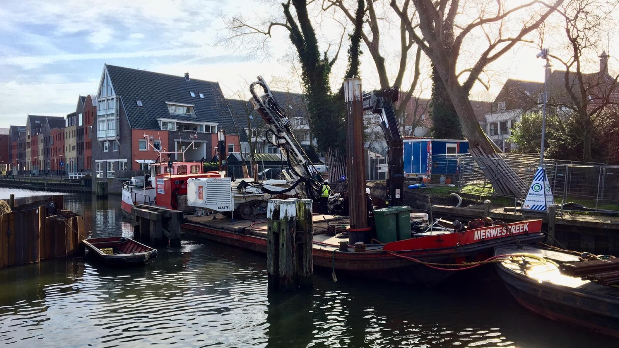 De overige werkzaamheden bij de kadeverbetering bestonden uit het trekken en zetten van houten palen, het aanbrengen van verankering in de damwanden door middel van schroefinjectieankers, en het aanbrengen van een deksloof van beton en grondwerk. Natuurlijk zorgden we voor een omleiding in de tijd dat de brug niet in gebruik was.