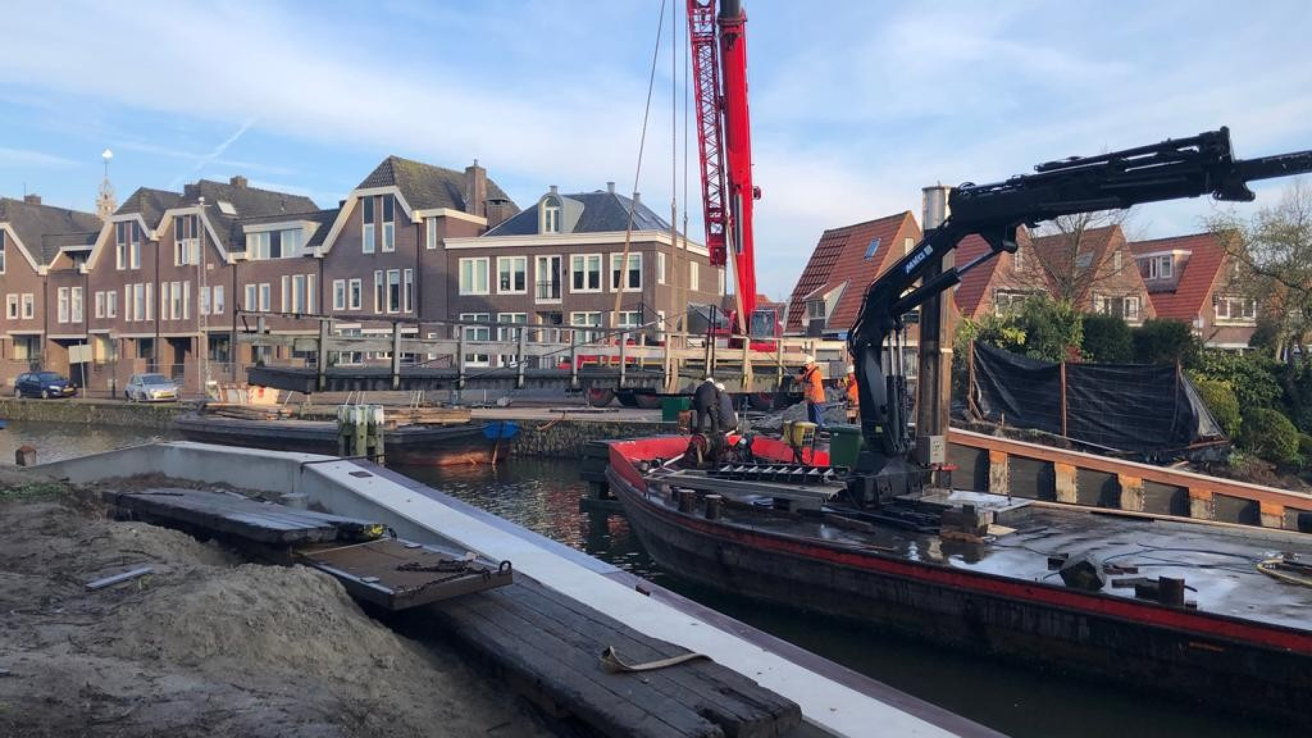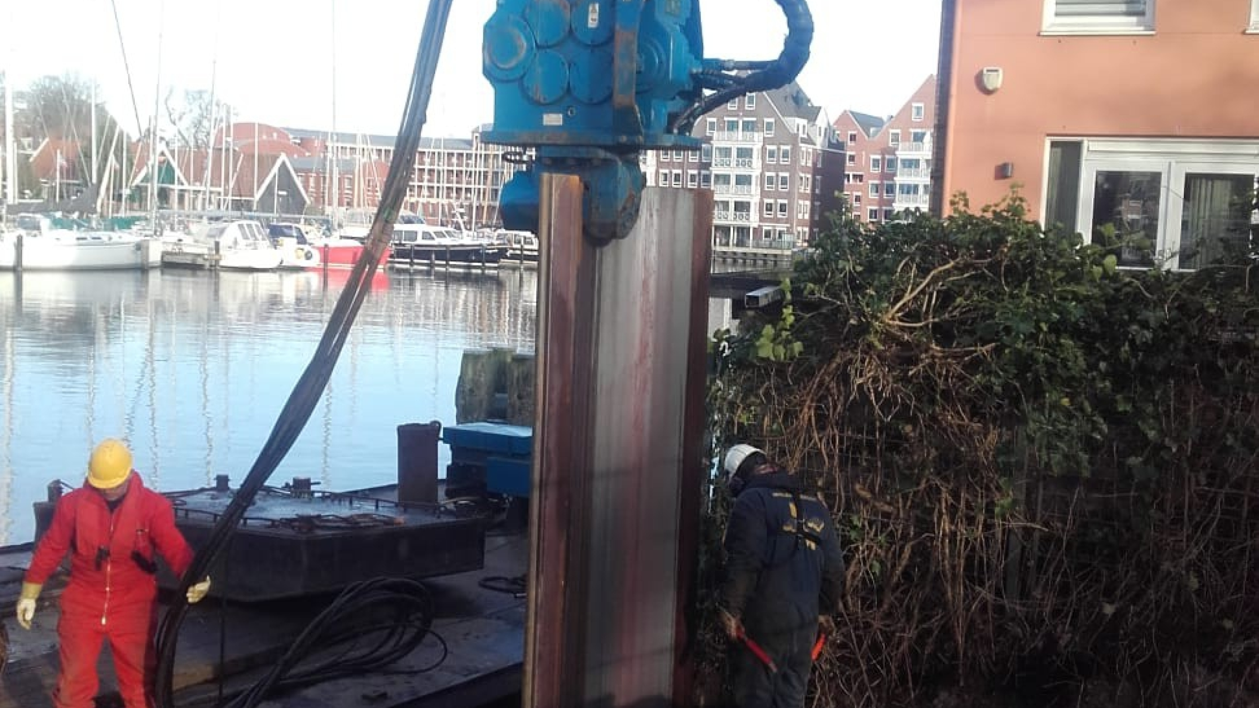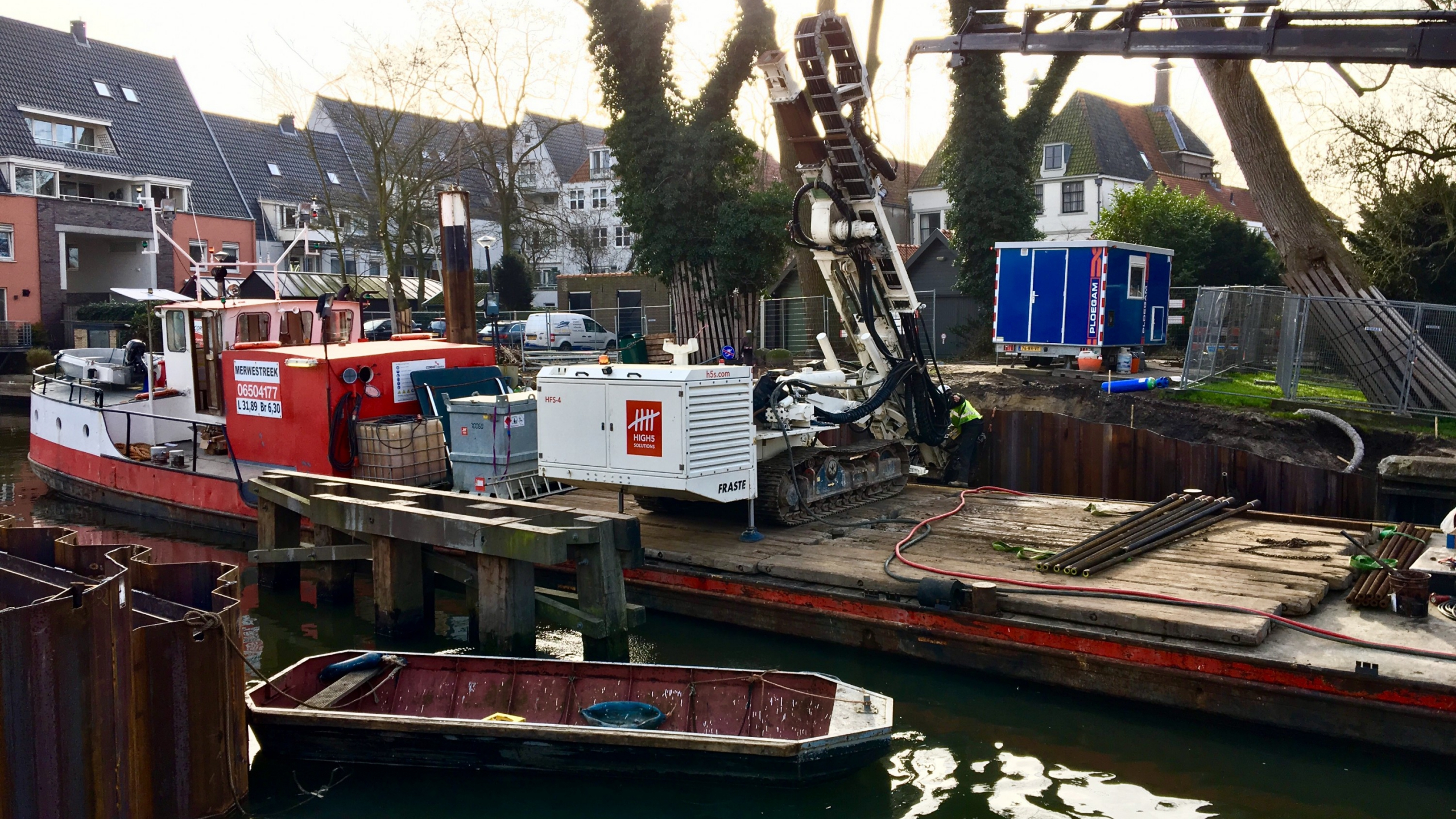 De overige werkzaamheden bij de kadeverbetering bestonden uit het trekken en zetten van houten palen, het aanbrengen van verankering in de damwanden door middel van schroefinjectieankers, en het aanbrengen van een deksloof van beton en grondwerk. Natuurlijk zorgden we voor een omleiding in de tijd dat de brug niet in gebruik was.