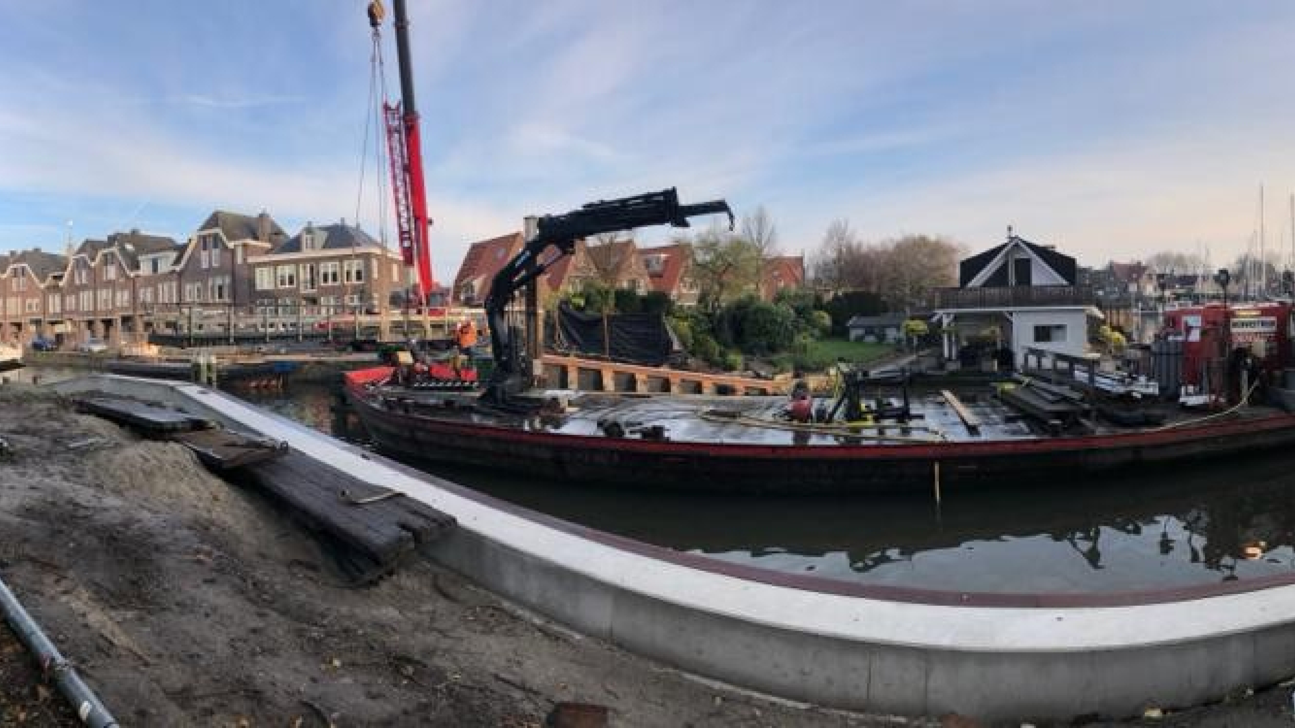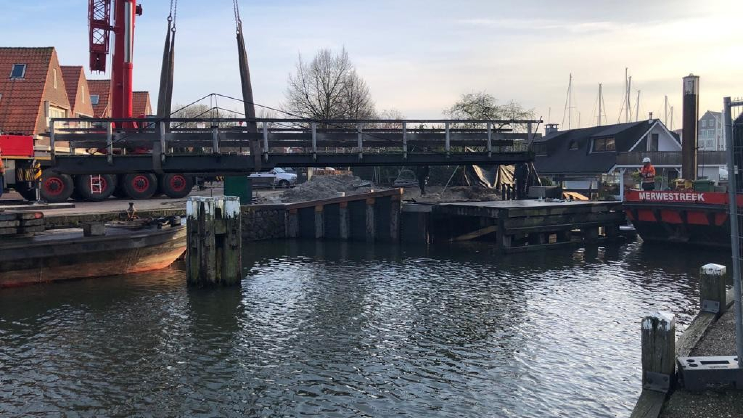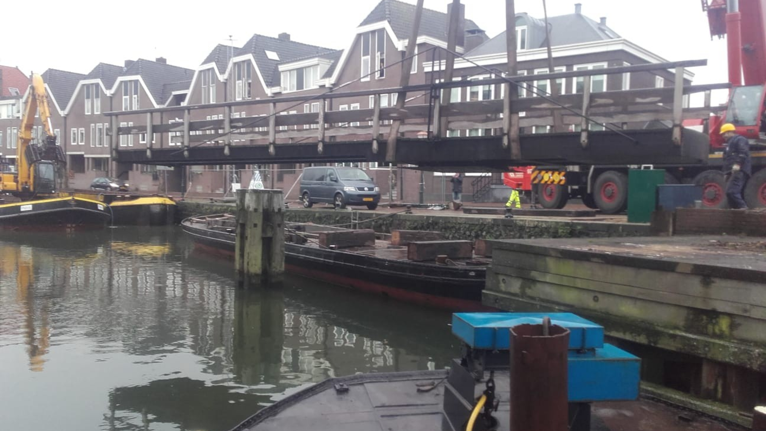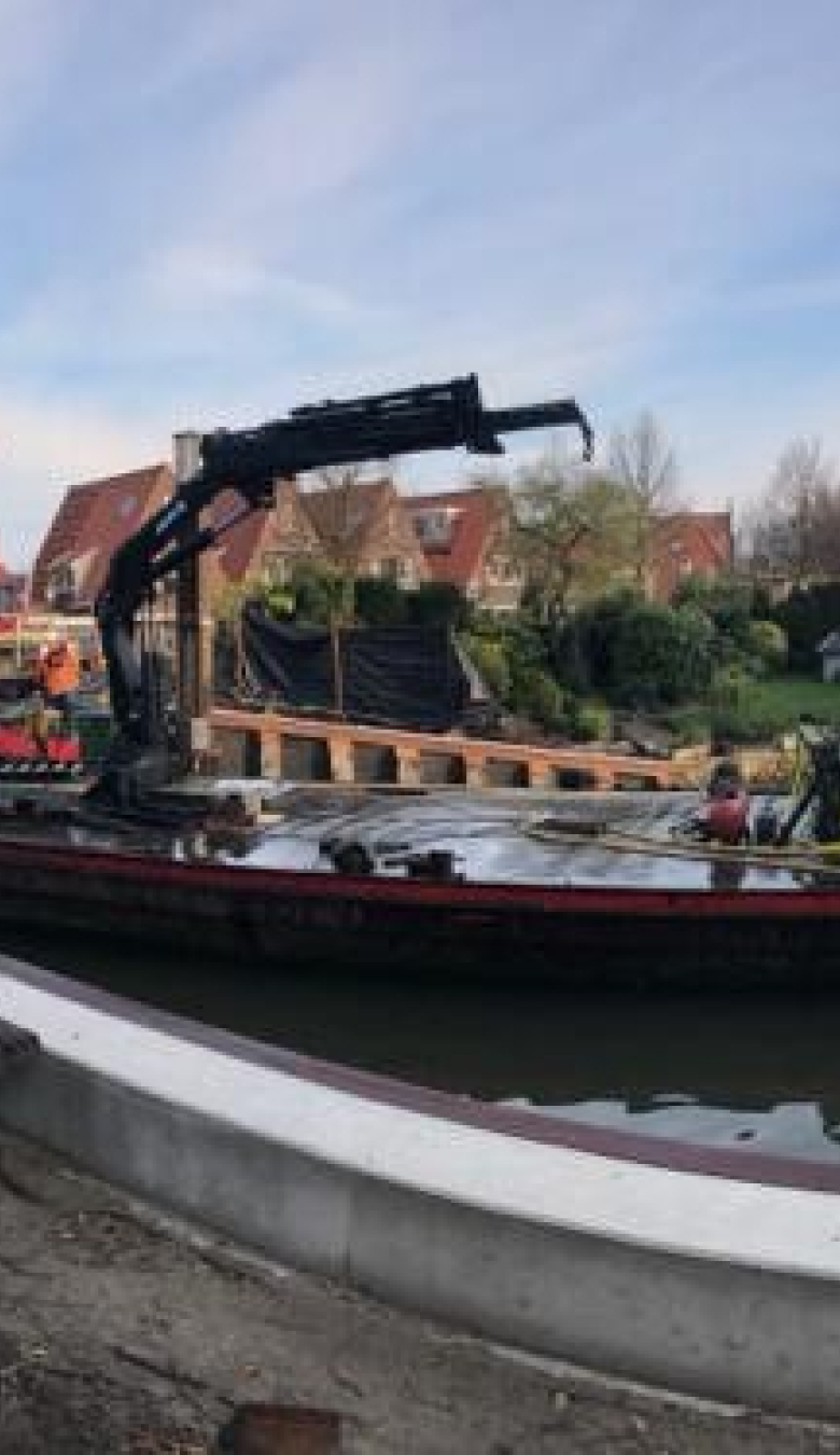 De brug werd, inclusief loopsteiger en loopplateau, verplaatst via het water naar het depot. Zo kregen wij de ruimte om de bestaande damwandconstructie te verwijderen en deze te vervangen en voorzien van een betonnen deksloof. De werkzaamheden zijn vlot verlopen en de brug ligt weer netjes op zijn plaats. In de laatste periode monteerden we de brug en de loopsteiger af, werkten we de kunststofbekleding af en plaatsten we het straatwerk en -meubilair terug.